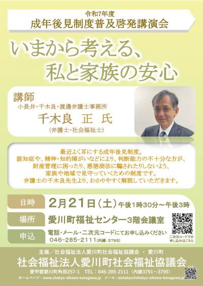 愛川町社会福祉協議会では、成年後見制度普及啓発講演会を開催します。